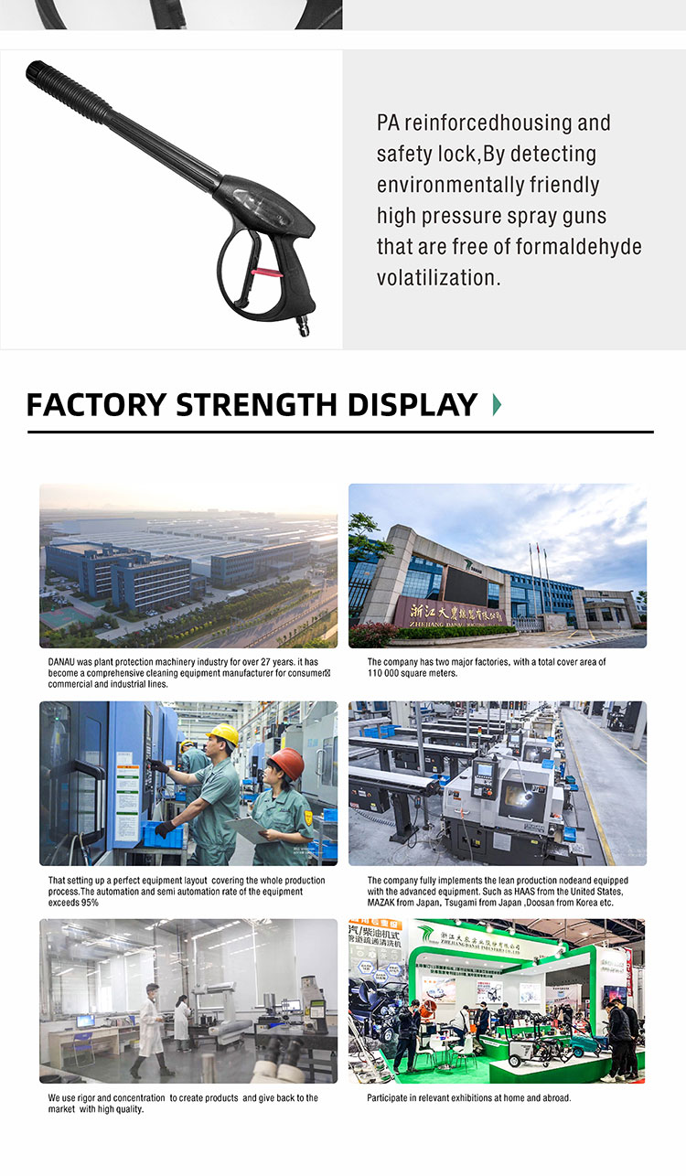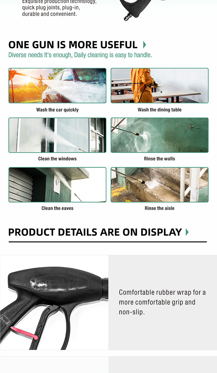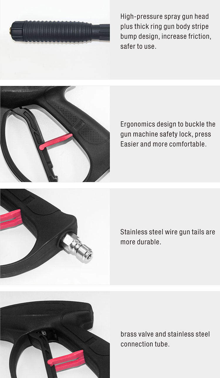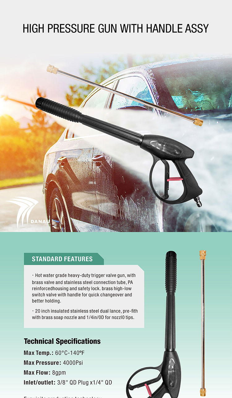 Heavy-duty trigger valve gun, with brass valve and stainless steel connection tube, PA reinforced housing and safety lock. 20inch stainless steel wand with 1/4in. QD for nozzle tips.