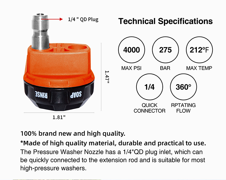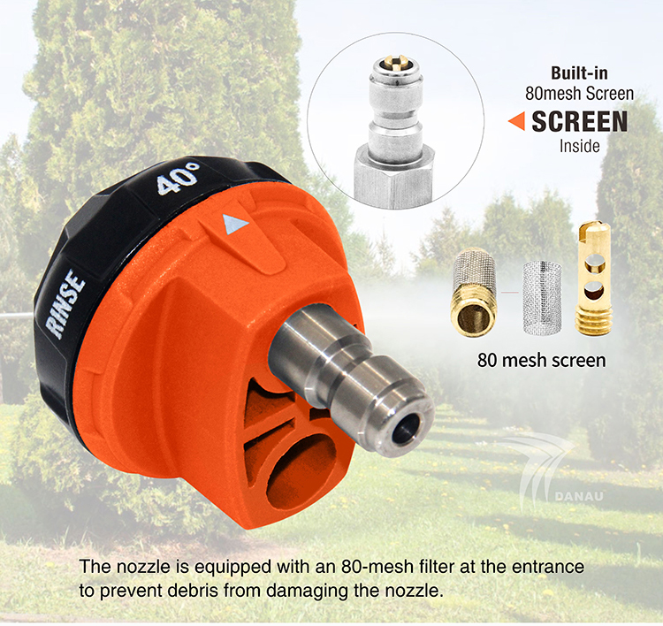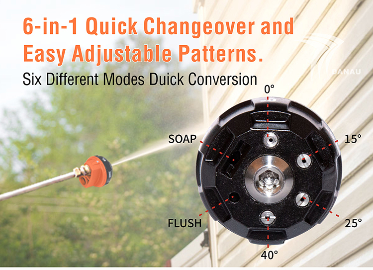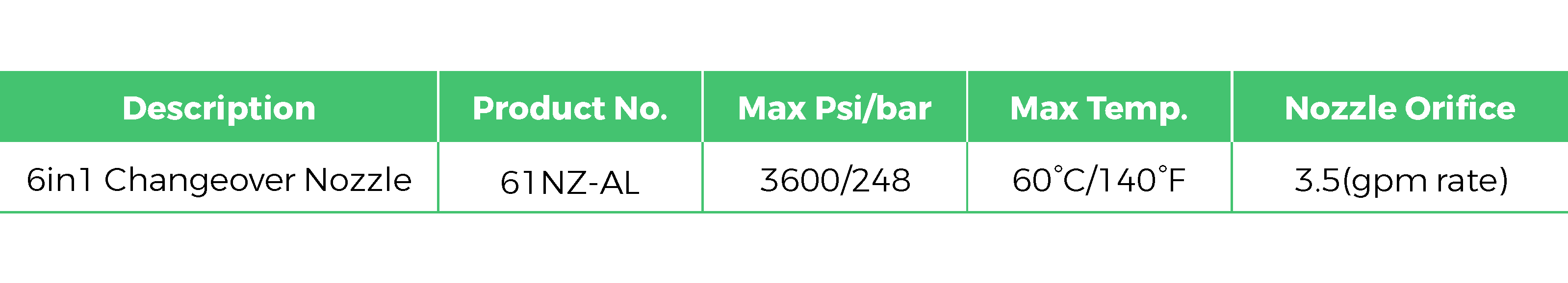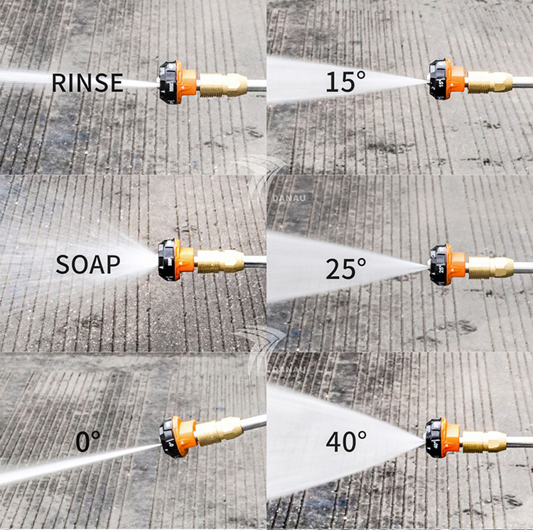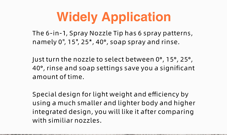 Fast and easy change over the nozzle for spot cleaning, rinsing and detergent application.Built in nozzle with spray patterns 0° , 15°,25° , 40° ,soap spray and rinse.