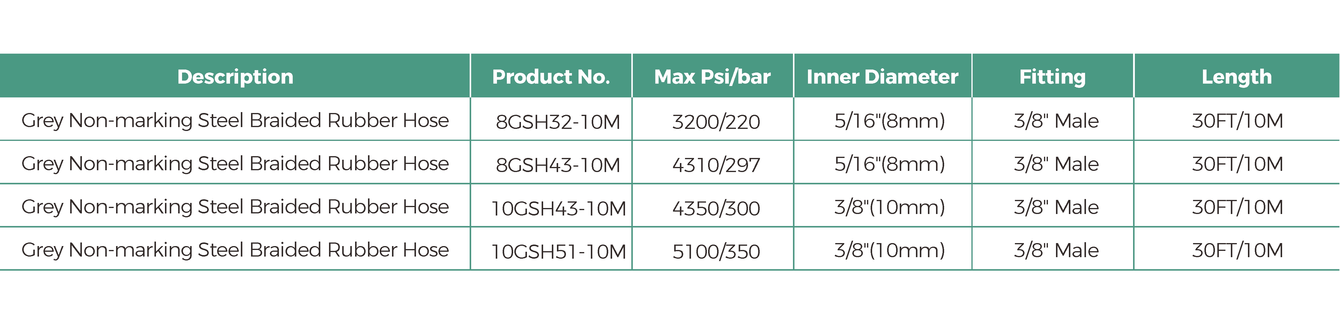Heavy-duty steel wire braided,cover with Non-marking grey rubberized fabric.Bursting pressure 4:1 of rated working pressure. 3/8" Quick disconnect fitting. ID size available for 5/16" and 3/8" .Single or dual wire braided. Length available for 10, 15, 20 and 30 meter.