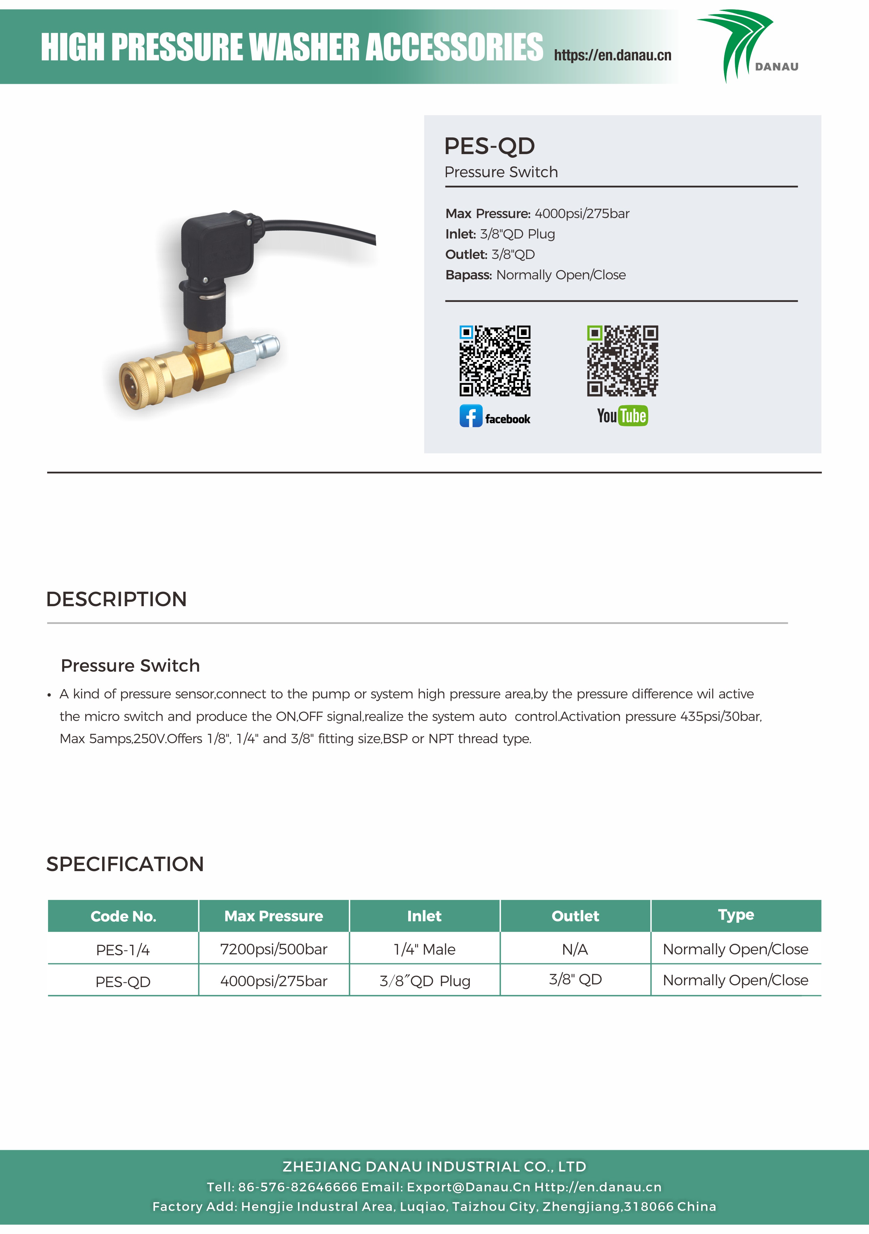 - A kind of pressure sensor,connect to the pump or system high pressure area,by the pressure difference wil active the micro switch and produce the ON,OFF signal,realize the system auto control.Activation pressure 435psi/30bar,Max 5amps,250V.Offers 1/8", 1/4" and 3/8" fitting size,BSP or NPT thread type.
