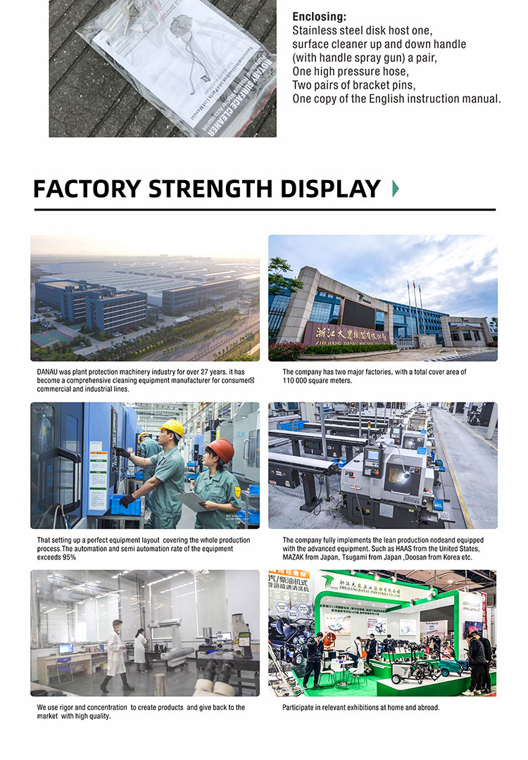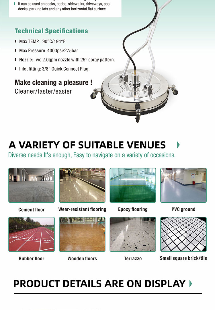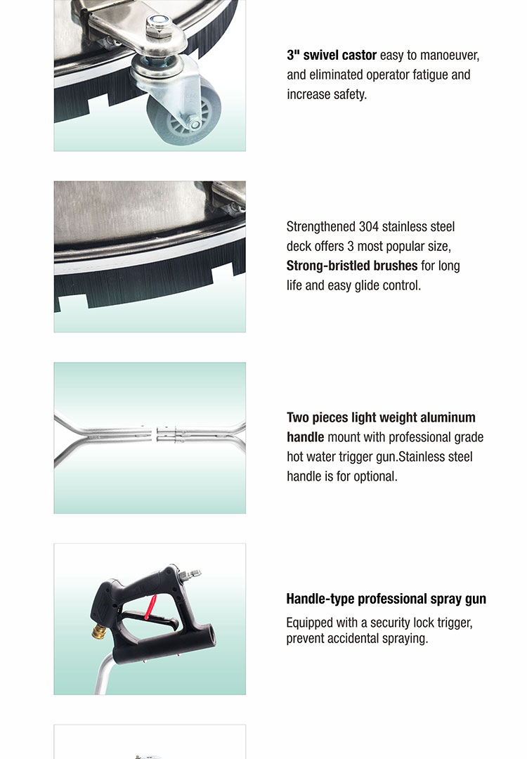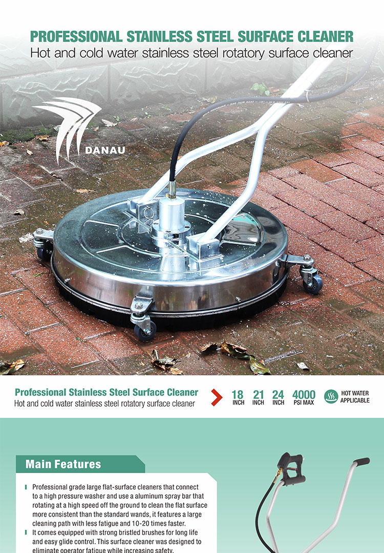 Professional grade large flat-surface cleaners that connect to a high pressure washer and use a aluminum spray bar that rotating at a high speed off the ground to clean the flat surface more consistent than the standard wands, it features a large cleaning path with less fatigue and 10-20 times faster. It comes equipped with strong bristled brushes for long life and easy glide control. This surface cleaner was designed to eliminate operator fatigue while increasing safety. It can be used on decks, patios, sidewalks, driveways, pool decks, parking lots and any other horizontal flat surface.