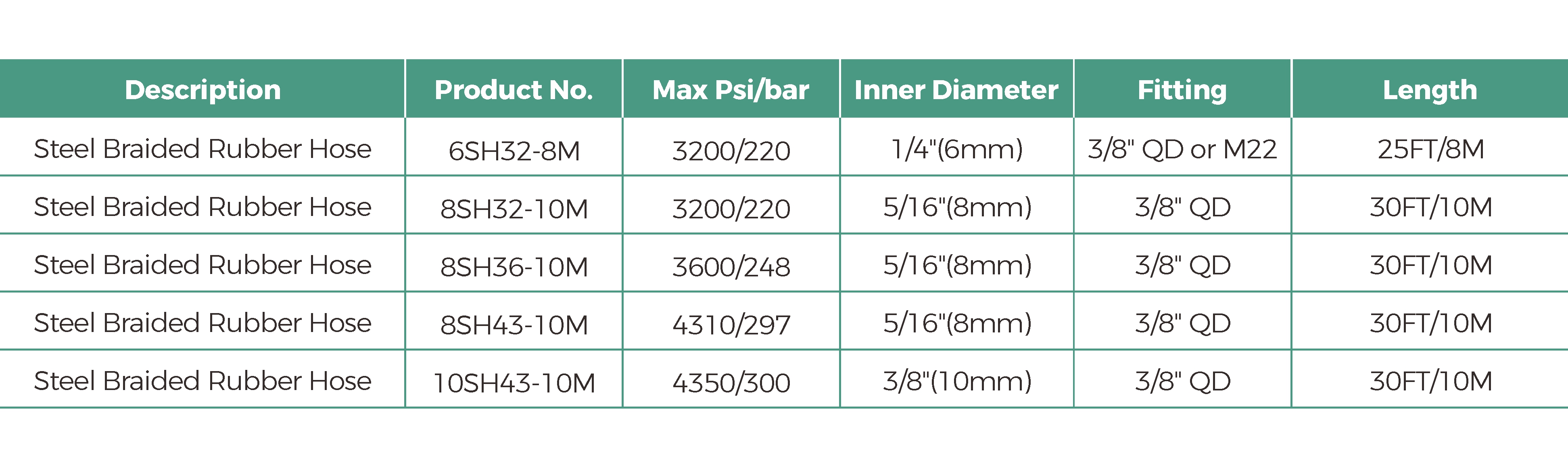 Heavy-duty steel wire braided,cover with rubberized fabric. Bursting pressure 4:1 of rated working pressure.3/8" Quick disconnect fitting.ID size available for 1/4", 5/16" and 3/8". Single or dual wire braided.Length available for 10, 15, 20 and 30 meter.