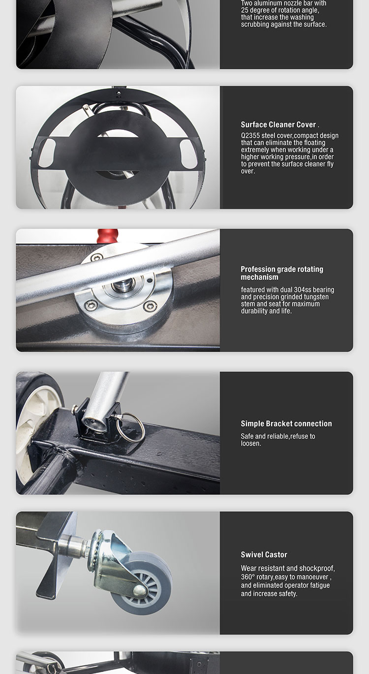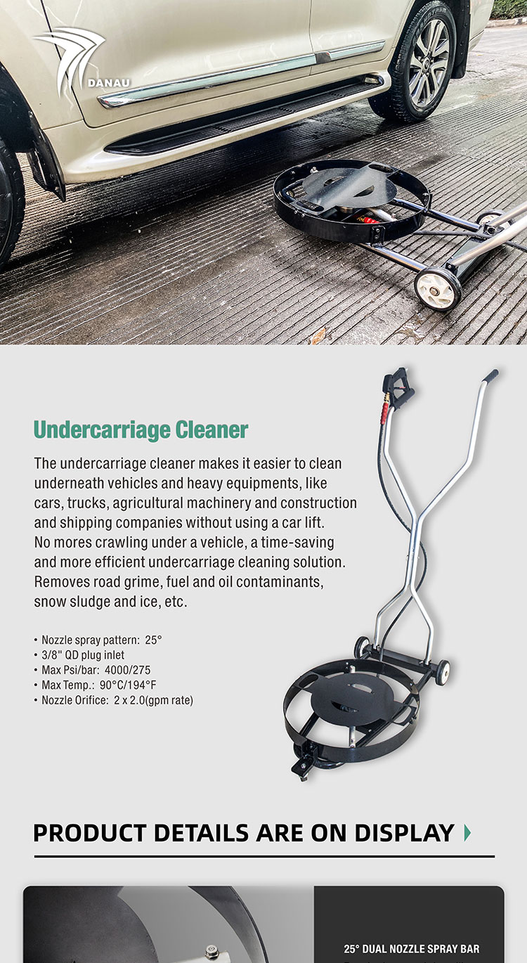 The undercarriage cleaner makes it easier to clean underneath vehicles and heavy equipments, like cars, trucks, agricultural machinery and construction and shipping companies without using a car lift. No mores crawling under a vehicle,a time-saving and move efficient undercarriage cleaning solution. Romoves road grime, fuel and oil contaminants, snow sludge and ice, etc.